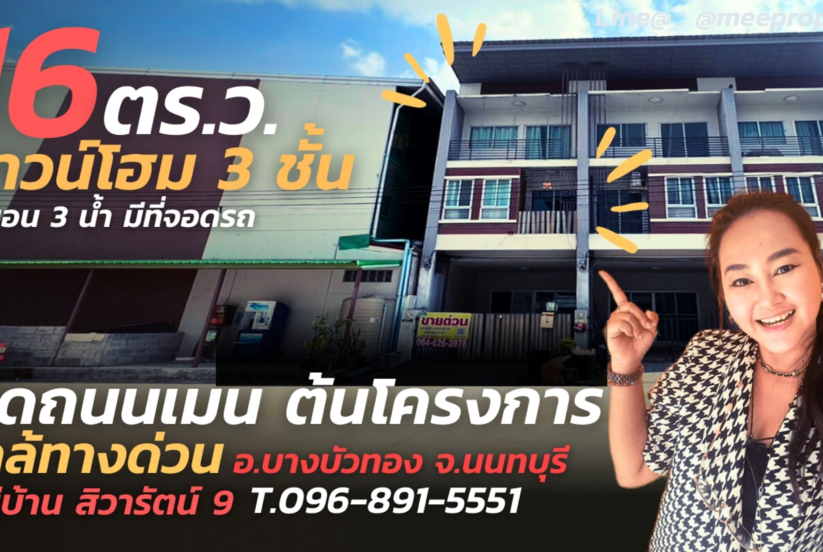 ขายทาวน์โฮม 3 ชั้น 16 ตร.ว. สไตล์โมเดิร์น หน้าบ้านติดถนนเมนหมู่บ้าน มบ.สิวารัตน์ 9 อ.บางบัวทอง จ.นนทบุรี ใกล้เซ็นทรัล เวสต์เกต และ Mrt คลองบางไผ่/Mrt บางใหญ่